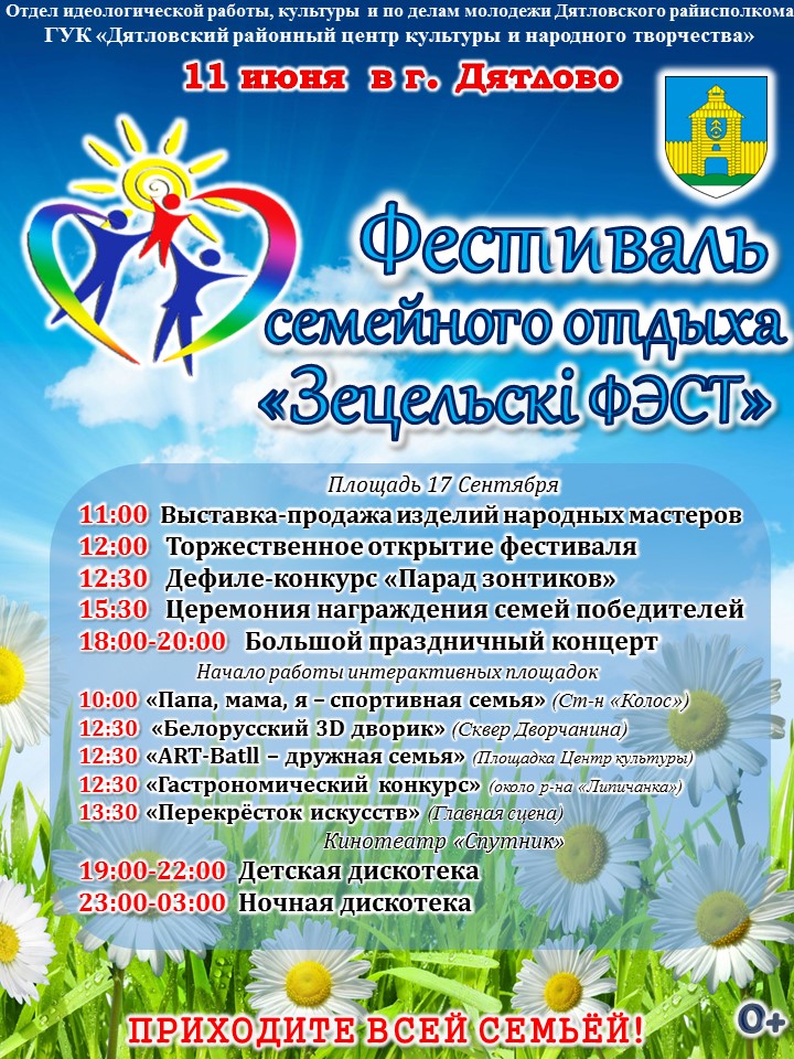11 июня 2022 года приглашаем всех на открытый региональный фестиваль семейного отдыха «Зецельскі фэст». Уникальное событие в культурной жизни Дятловщины, соберёт вместе артистов и мастеров, любителей и профессионалов, объединённых желанием сберегать и развивать традиции семейного художественного творчества.  Интерактивные площадки «Перекрёсток искусств», «Белорусский 3D дворик», «Мама, папа, я – спортивная семья», «ART-Battle — дружная семья» с нетерпением ждут своих участников.