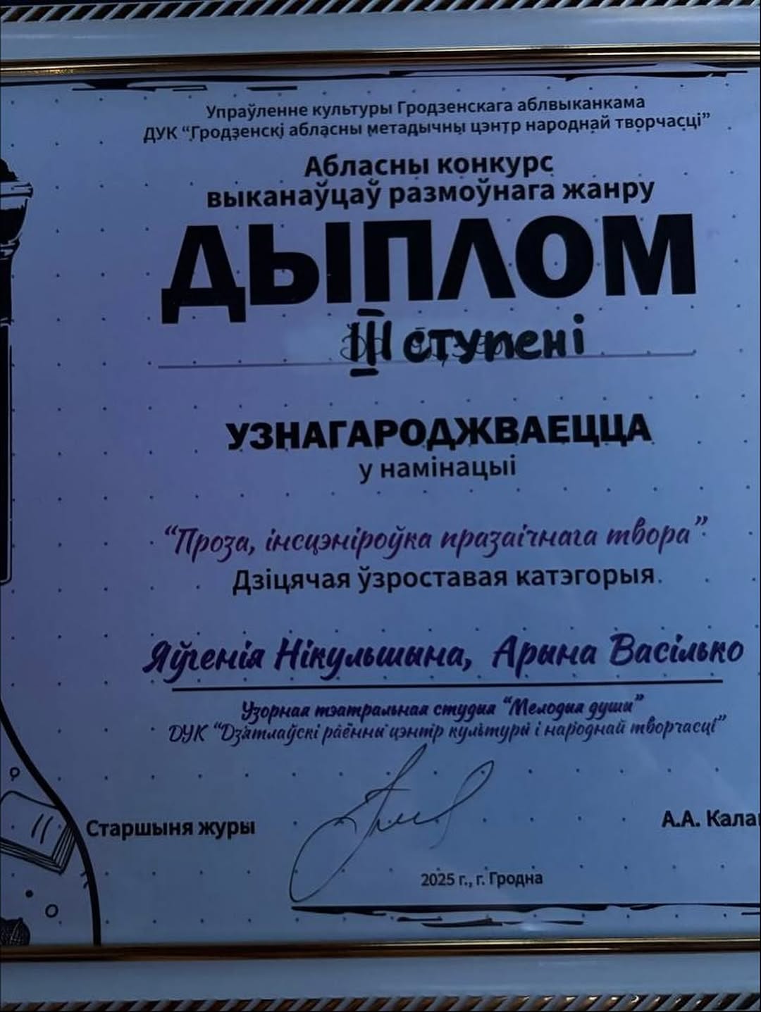 У другім аддзяленні Цэнтр культуры г. Дзятлава прадставілі дуэт узорнай тэатральнай студыі “Мелодыі душы” Нікульшына Яўгенія і Васілька Арына — 🥉Дыплом 3 ступені ў намінацыі “проза” (кіраўнік Аксана Кашляк)