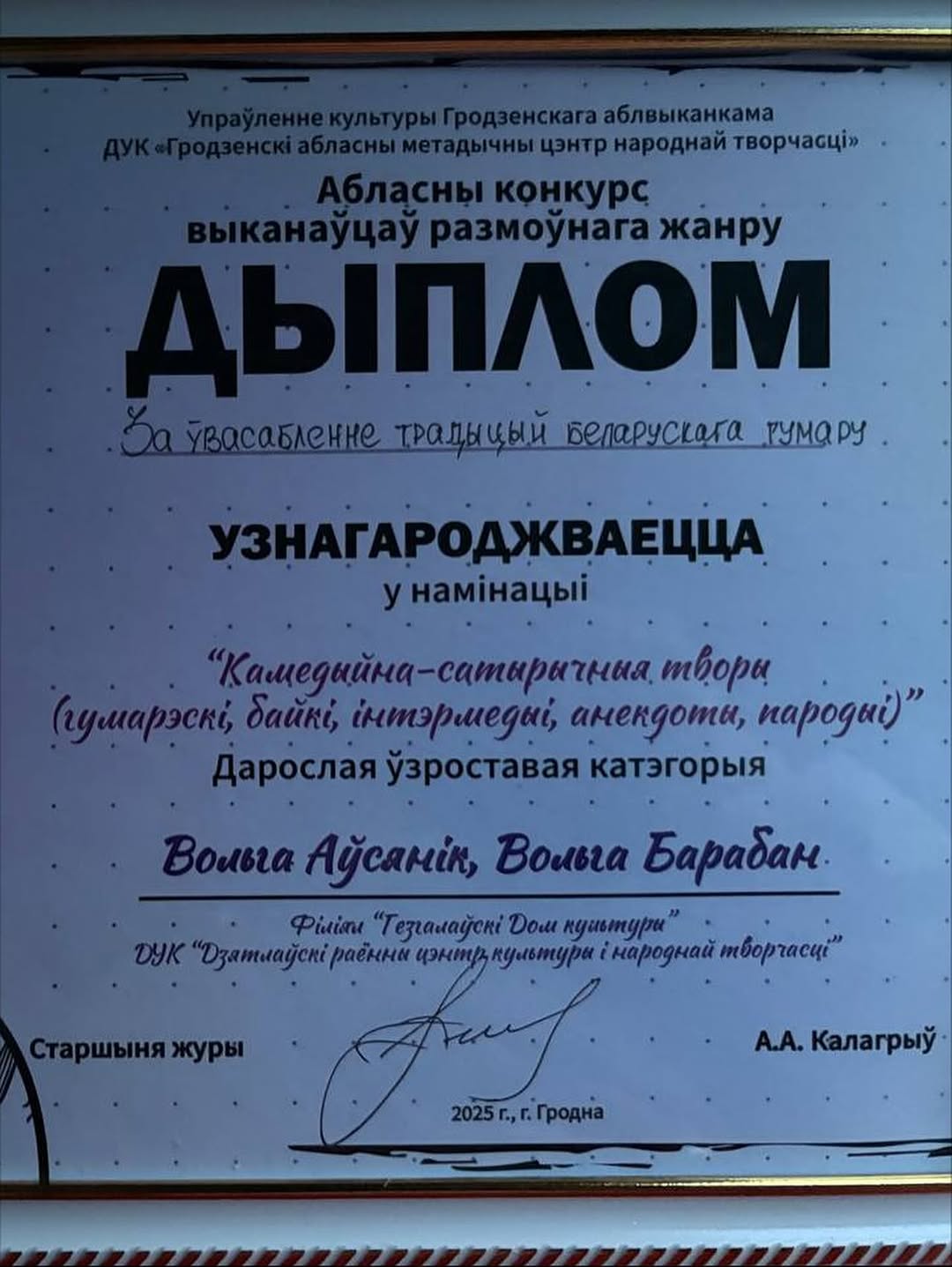 Гезгалаўскі дом культуры прадставіў творчы дуэт Вольгі Аўсянік і Вольгі Барабан — дыплом “За увасабленне традыцый беларускага гумару”