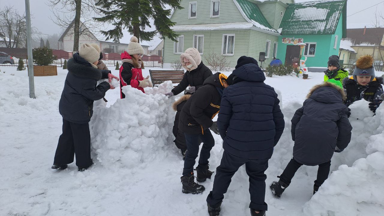 Но наши юные герои не растерялись! Командами они построили для Яги не просто снежную крепость, а целый волшебный коттедж.